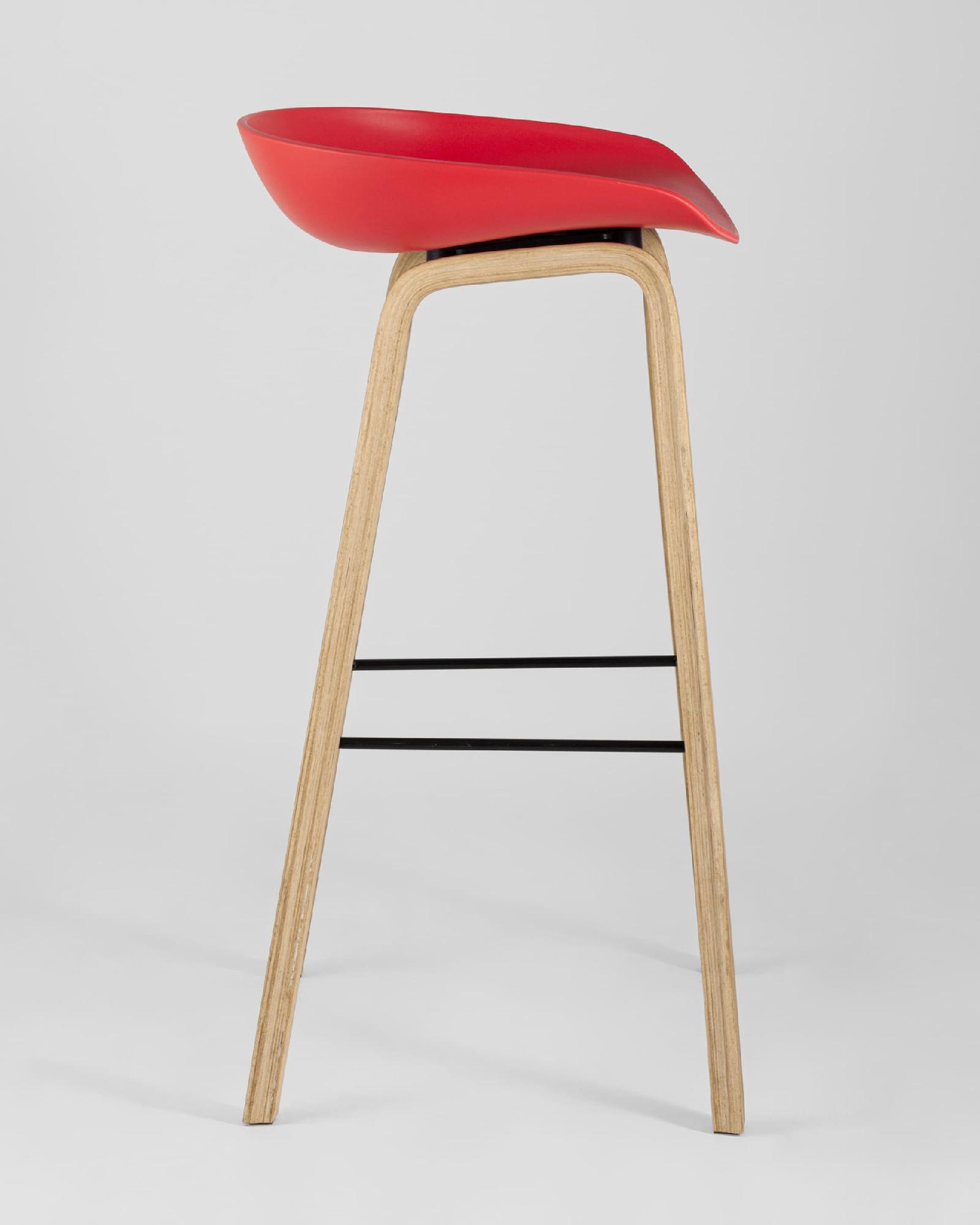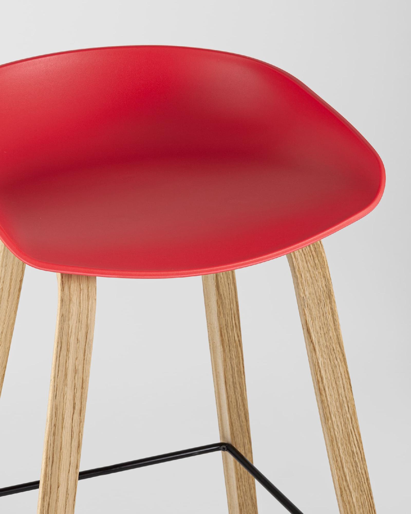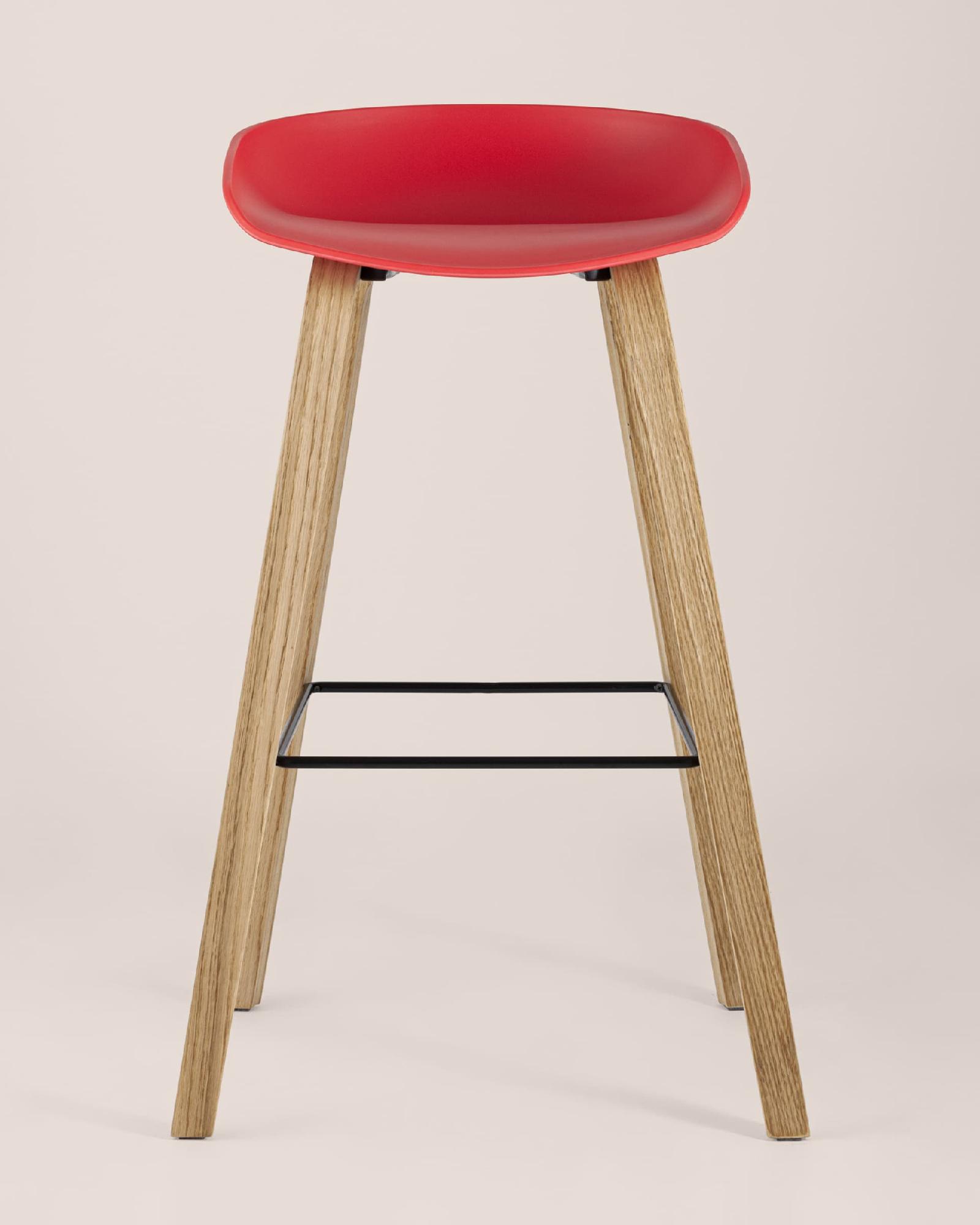 В дизайне модели «Либра» используется сочетание красного пластика и естественного оттенка натурального дерева – опоясывающая ножки опорная планка в тон сиденью уравновешивает цветовую комбинацию и подчеркивает модные геометрические формы барного стула. Высота соответствует стойке стандартной высоты.