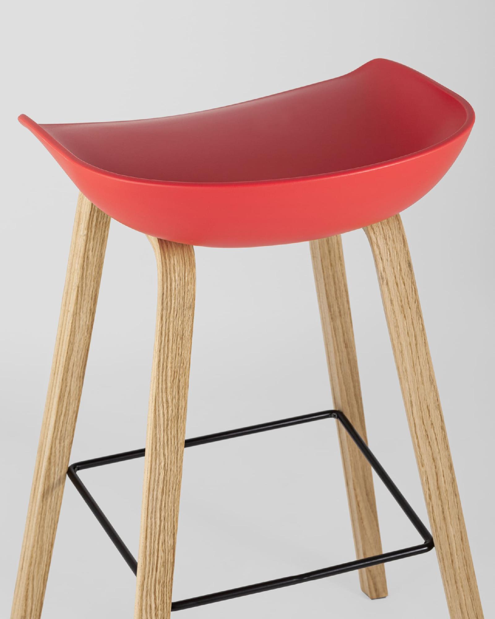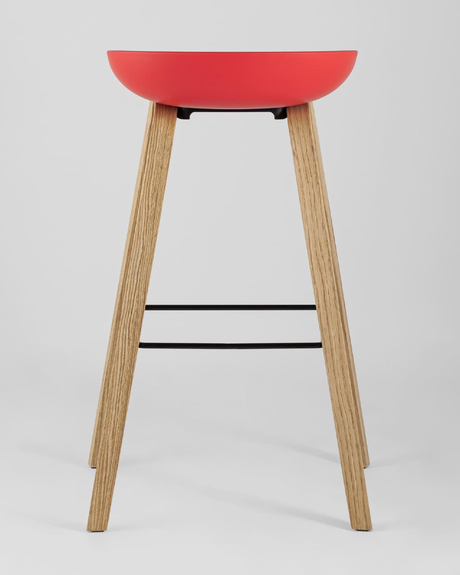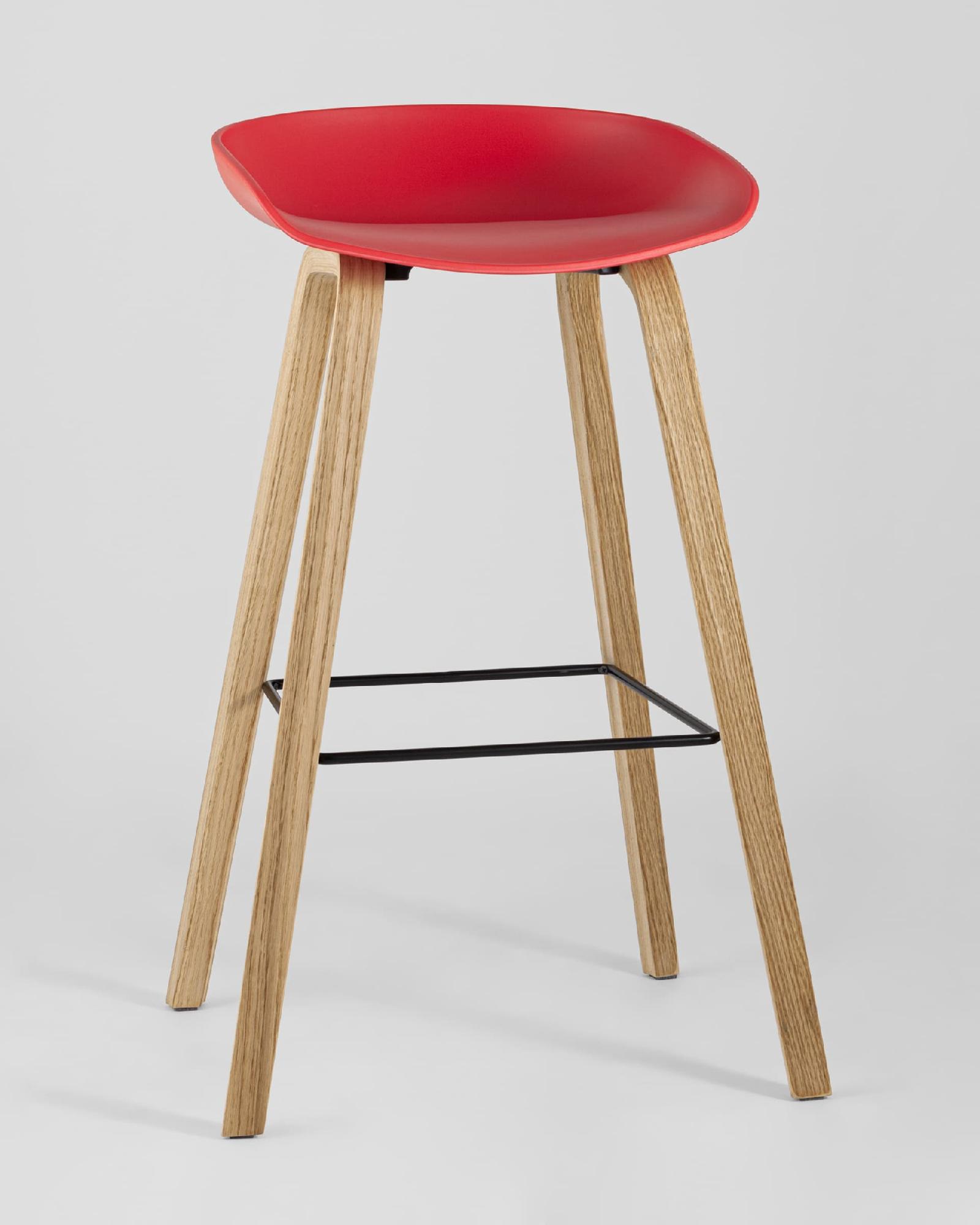 В дизайне модели «Либра» используется сочетание красного пластика и естественного оттенка натурального дерева – опоясывающая ножки опорная планка в тон сиденью уравновешивает цветовую комбинацию и подчеркивает модные геометрические формы барного стула. Высота соответствует стойке стандартной высоты.
