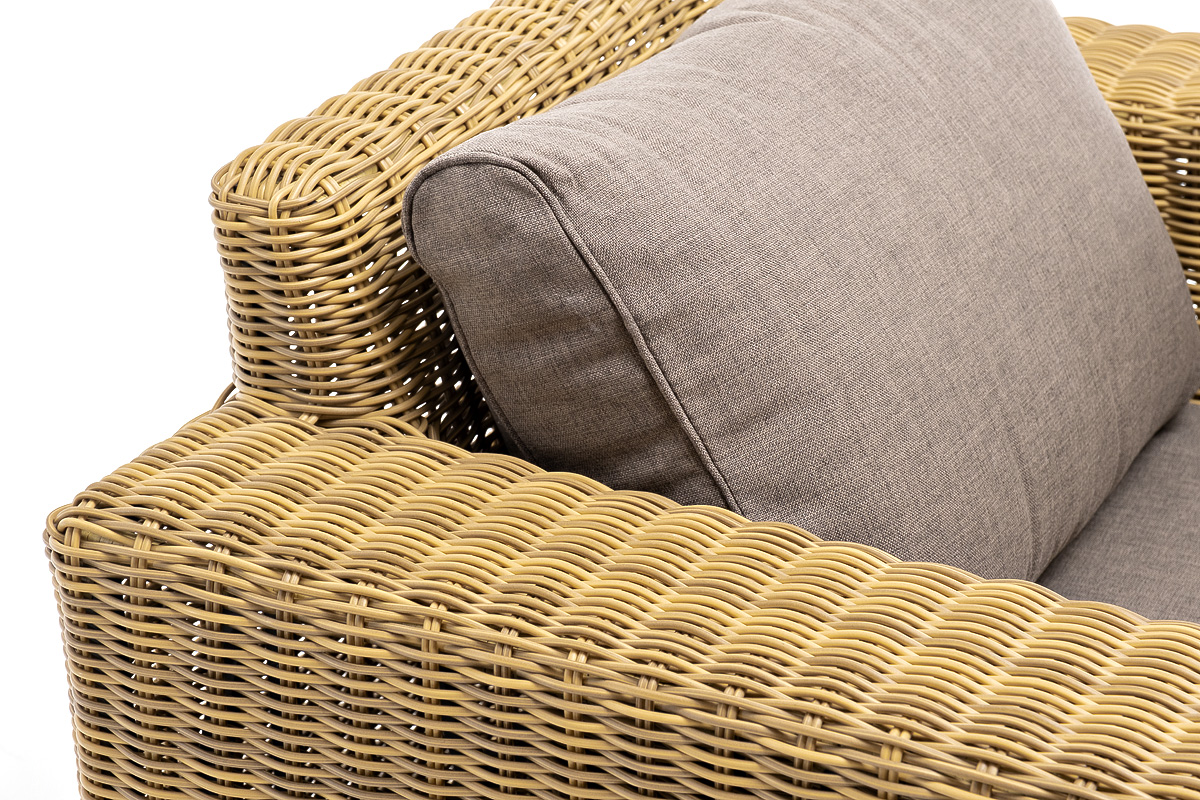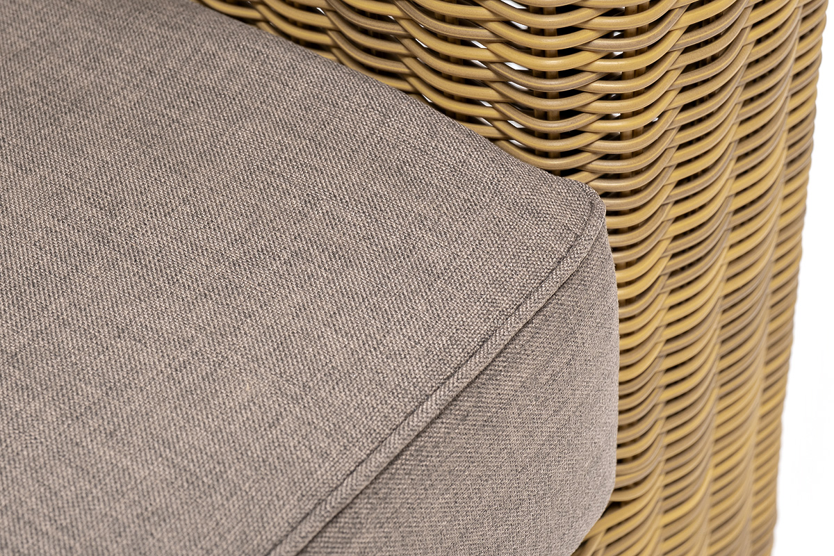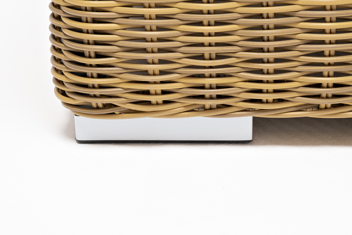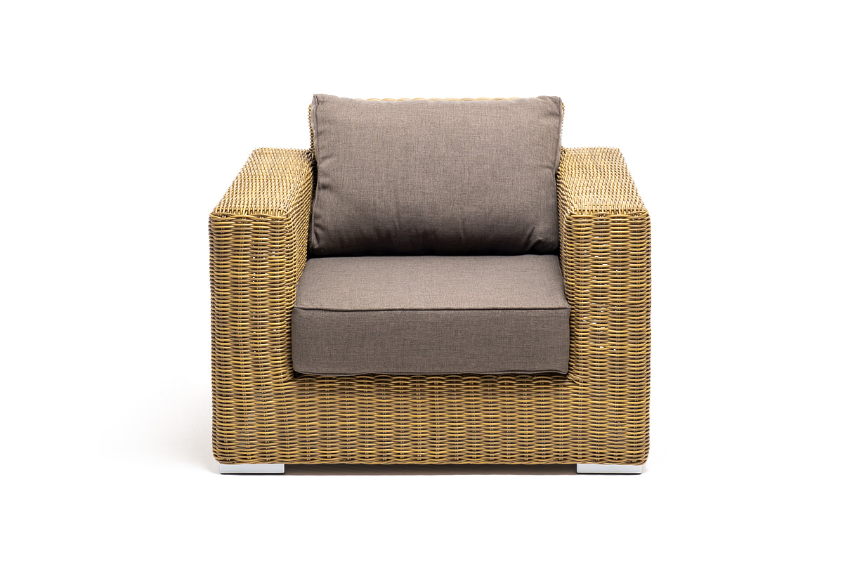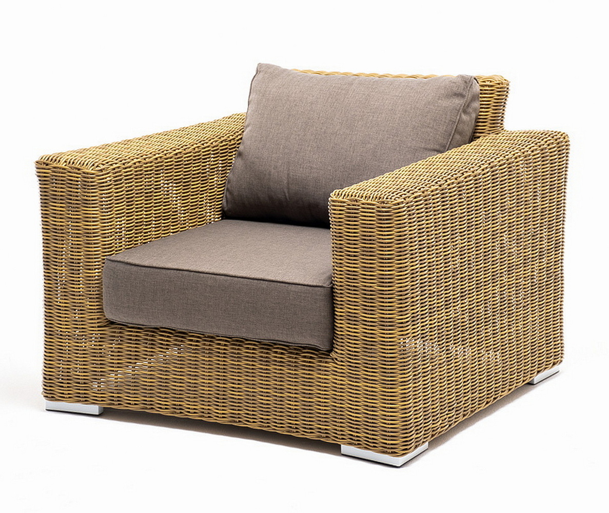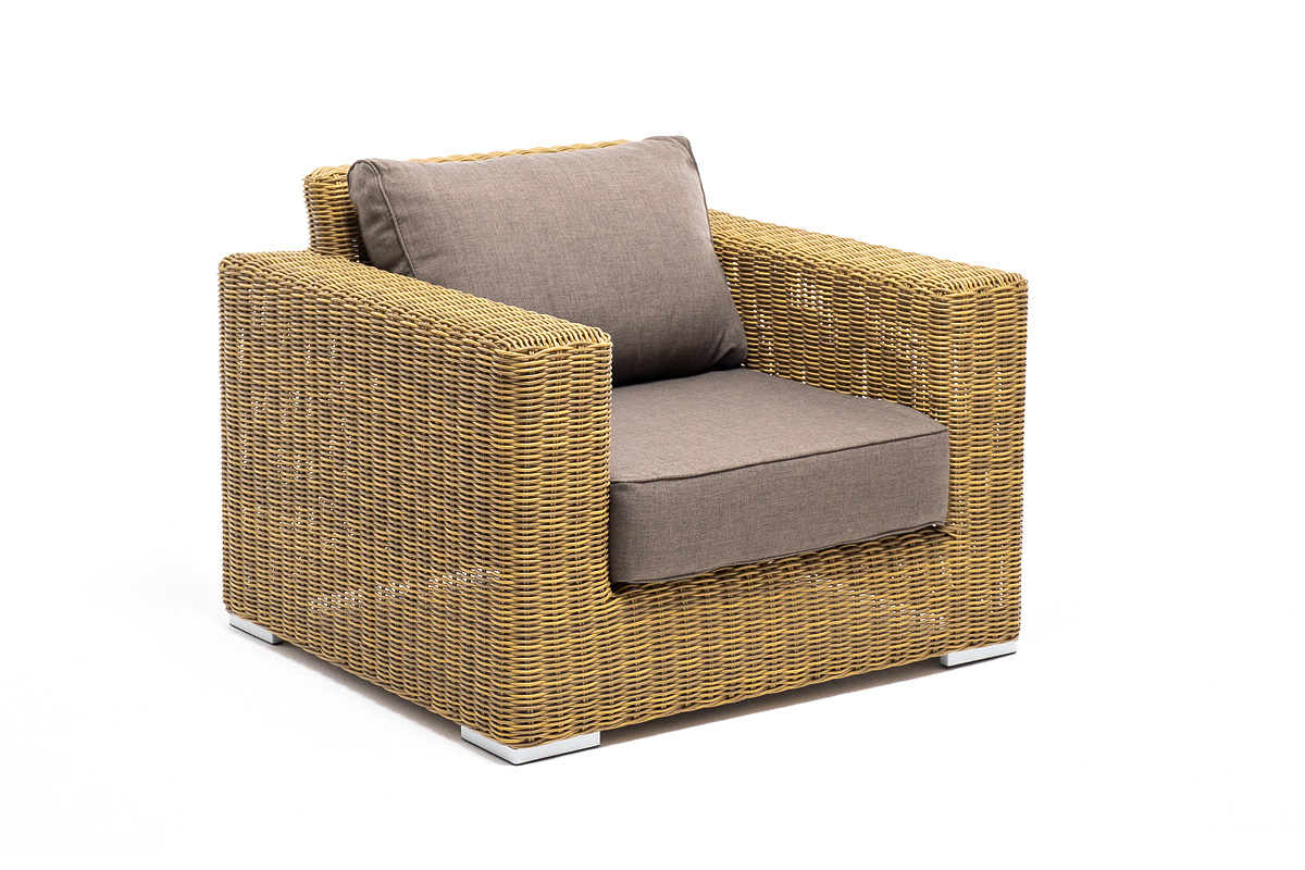Кресло оснащено каркасом из прочного алюминия, ручное круглое плетение является основным декоративным элементом мебели. Оно выполнено из искусственного ротанга в соломенном цвете.