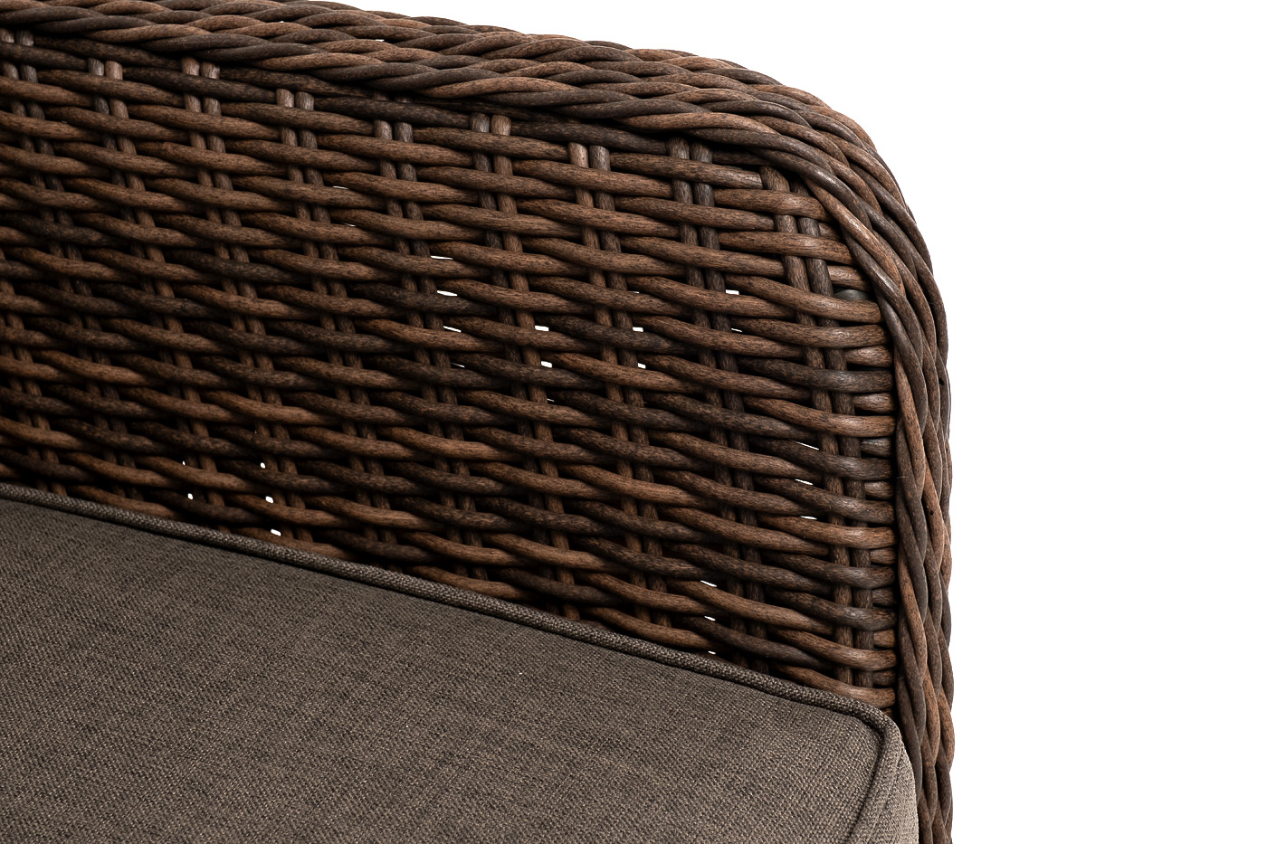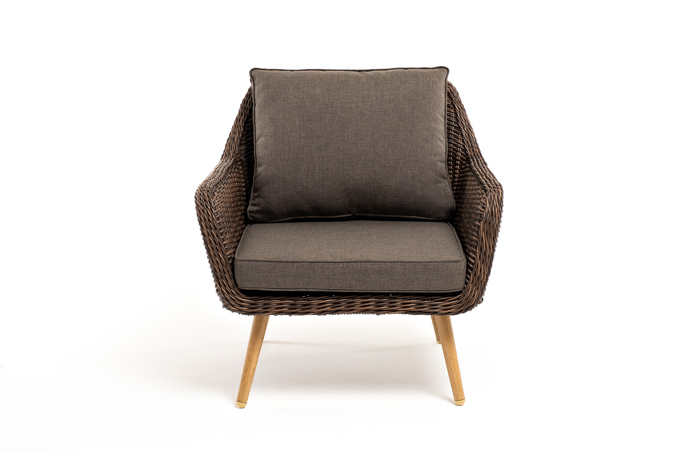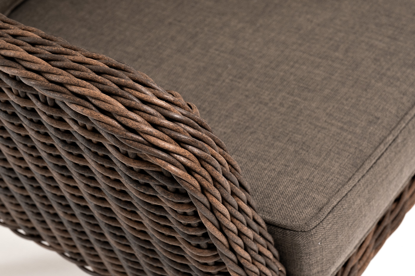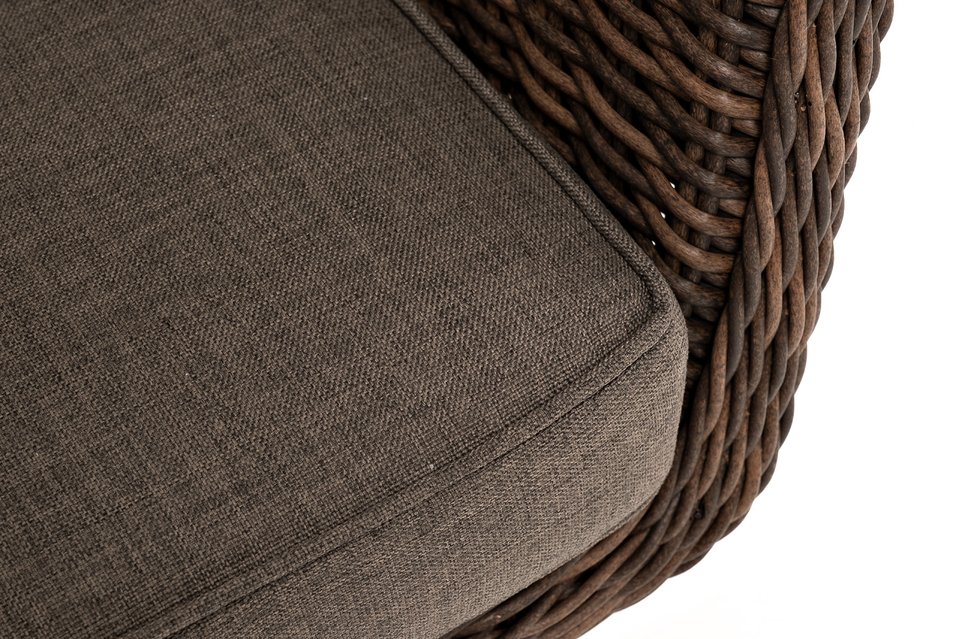 В комплекте с уличным ротанговым креслом идут мягкие подушки со съёмными чехлами серо-коричневого оттенка. Они пошиты из полиэстера, который не боится повышенной влажности благодаря наличию влагоотталкивающей пропитки. Плотность ткани составляет 230гр/м2.